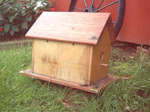 Please pardon the bird poop all over this...it's the two sided birdhouse I spoke of in a reply to Lilith. We had it in the crux of our maple tree all summer cause we haven't had a chance to put it up on a post yet! The middle (inside) has a divider....and two families can live in it at once! So really cool when it's all cleaned up! Has brass tips even!