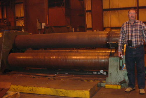 Custom steel fabrication involves the forming and assembly of materials to the customers specification. This company leans toward the heavy side with equipment like this one Grumbles is standing next to and able to roll a 1” thick x 8 ft. wide, steel plate into a cylinder.