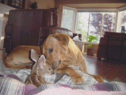 My sister sent me these pics in email the other day. The story said that the momma was killed by a car and a couple adopted the baby till it was strong enough to go to a better home. Seems "momma's" come in many forms.