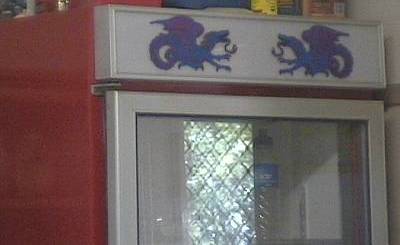 cool! now ive got thoughts of paint ours LOL, i like the glass, our beer fridge is just plain old plain old :S very nice dragons