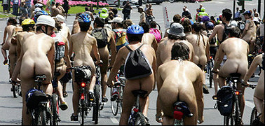 Naked bikers ride during the world naked bike ride to protest against cars and agressive drivers in the streets of Madrid.(AFP/Philippe Desmazes)