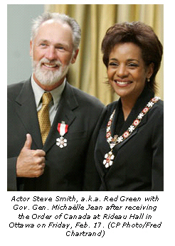 Actor Steve Smith, a.k.a. Red Green with Gov. Gen. Michaëlle Jean after receiving the Order of Canada at Rideau Hall in Ottawa on Friday, Feb. 17.