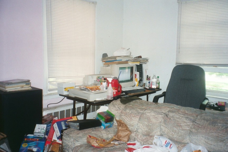 Here's a picture to give you an idea of what I'm talking about....You can see my computer area (Disregard the mess, please!  ) and the couch to my left....well if you visualize the couch extending back away from the computer..that's his favorite seat.