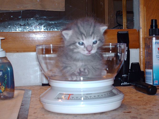 We have a little nightly ritual here at the Cathouse, each kitten has to be weighed so we can see if they're eating enough. Plus, they just look so damn cute in the scale! Should I perhaps have put these pics in our "Pixies Power" thread?