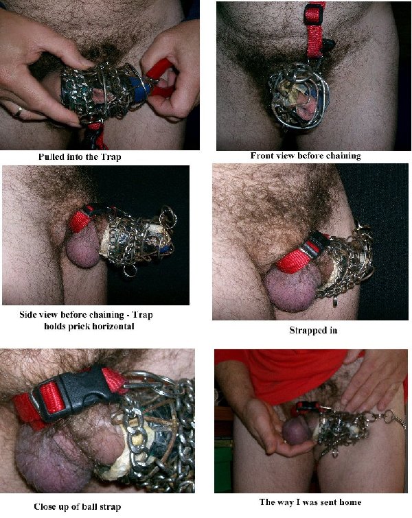 I was quickly unstrapped from the vice and my prick was pulled into the tube of the Trap. My balls were then belted into place and a chain from the end of the Trap was wrapped around the top of my left thigh pulling the contraption tight and effectively tying my prick to the top of my leg.