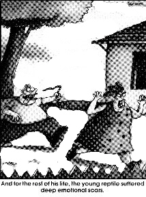 my kid, the cute one, comes home and says, " I saw this BIG lizard as I was walking home. "