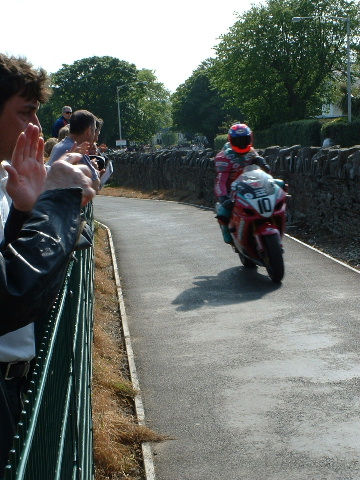 This is the 3rd place rider of the first race (Formula 1) coming up the lane to the pits - they get so close you can talk to them, if you want!