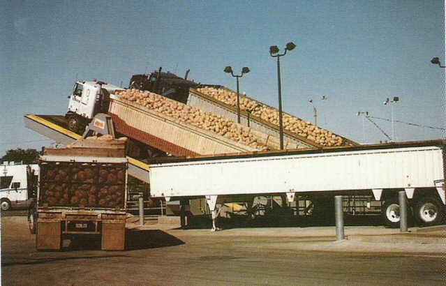I mentioned (above) that they do a log of pumpking processing around here. Here's a picture I scanned of trucks unloading the pumpkins that maybe you'll find interesting.
