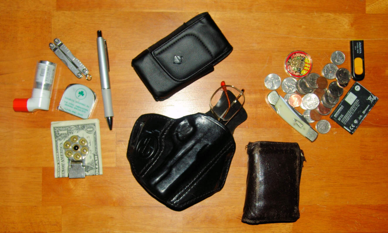 Just got home from our daughter's home near Joliet, IL and dumped everything out of my pockets. Then, I got my laptop out and plugged in in and signed onto Pixies. Looked at this thread and checked and guess what ... the pockets were empty. Now, before I dumped everything out, I had keys, hankerchiefs, billfold, pocket comb, change and some Life Savers ... but that's before I read the question. So, I guess I have to say ... NOTHING.