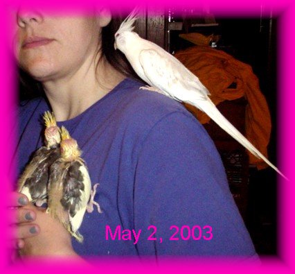 I know this thread has been dead for awhile but we have new babies and I wanted to share. The momma bird on my shoulder is a fallow, suppose to be very rare and she is the only one I have ever seen. The daddy bird is a pied (sp) and he flew out the window last night, grrr, so have lost him. The 2 babies in my hands look like the daddy other than they don't have all their feathers yet.