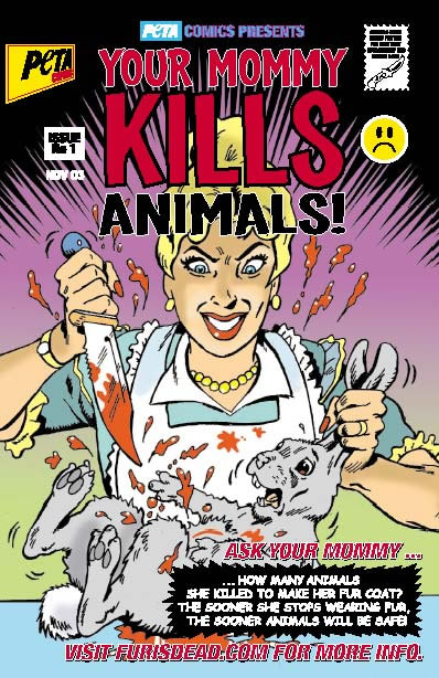 Kids will see the bloody truth behind their moms pretentious pelts. Accompanied by graphic photographs of skinned carcasses and animals languishing on fur farms, children will read: "Lots of wonderful foxes, raccoons, and other animals are kept by mean farmers who squish them into cages so small that they can hardly move. They never get to play or swim or have fun. All they can do is cry-just so your greedy mommy can have that fur coat to show off in when she walks the streets."
