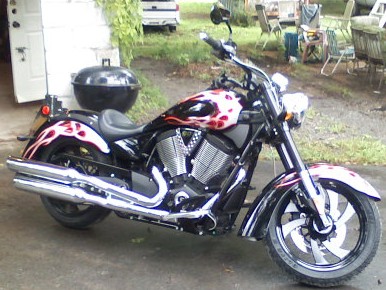 My car isn't noteworthy. It's a 91 Lebaron convertible. What I love about the paint job on my bike is it's a factory limited. They only produced so many Victory Vegas 8 Balls like that. Still wish I could have gotten the Honda VTX1800t though. Unfortunately, those are no longer made.