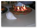 This ceremony is performed at the crack of dawn on the day of the wedding in the house of the bride and of the groom. About ten married women accompany the bride/groom to a nearby pond. They invite the Goddess Ganga to the wedding and bring back a pitcher of water from the pond to individually bathe the bride and the groom. Then they offer food to the bride/groom. The meal consists of puffed rice, raw yogurt, and sweets. The bride and groom cannot eat again until they are married. The relatives of the groom bless the bride and groom by placing yogurt on their foreheads (third eye) and saying prayers.