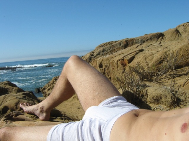 I was a mere 40 minute drive away from San Francisco but on a weekday found myself almost alone in this remote and largely uninhabited stretch of coast . I was on the clock but after finishing my delivery I found myself with about 2 hours before my next appointment and took advantage of the break to stop at a favorite beach called “Bean Hollow” for a little sun. It was a real treat to find myself the only one there as I left my car and walked across the sand facing the sandy ‘bean shaped’ cove with rocks and a low bluff on either side of it. This was a completely spontaneous outing so I was without swim trunks or other beach related gear. I did happen to have a towel and some sunscreen however so I simply rolled up my pant legs and carried the towel as I walked along the shore enjoying the slight tickle of the sand scrunching underfoot. I came upon a rock outcropping and paused to explore some tide pools before proceeding over the rocks to another smaller, more secluded cove. It was there that I settled, sitting back on the warm sand and gazed over the ocean and breathing in the fresh sea air. This area is often plagued by strong cold North westerly winds but today the winds was mild, warm and from the south and I quickly became hot sitting in the full sun. I stripped off my shirt and then paused to check if I was still alone before letting my pants drop leaving just in my boxers. The breeze over my slightly sweaty body was invigorating and I felt a slight tremor of excitement as the breeze worked its’ way through my boxers and over my cock and balls. There is something innately sexy about the beach even without scantily clad bodies and I was beginning to feel aroused by my surroundings.