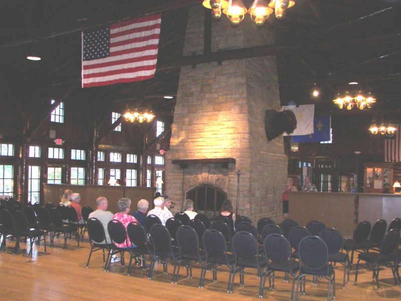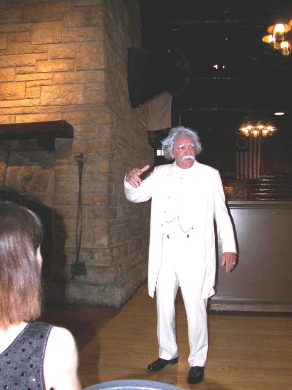 The entrance to the lodge, one of the "chain saw" art sculptures that are all around the grounds, the main hall where we were meeting to hear "Mark Twain" and finally, Mark Twain himself.