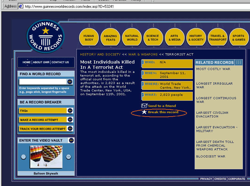 I too am upset by it. But I think that's a good thing. It keeps it fresh in my mind, and as horrible as it was, I never want it to fade from my memory. I want to remember the vivid details of that day so as to honor those that fell, to immortalize all those that gave everything to save another. I'd prefer that the information be out there as much as possible, so that others can remember too. So they can tell their children and grandchildren about it. So the terrible truth doesn't get whitewashed by time. I don't think terrorists need a few lines in Guiness' record book to derive inspiration, their hate lies outside of the trivial. Believe me, they were dreaming of something bigger the minute the towers fell. That's precisely why we can't forget.