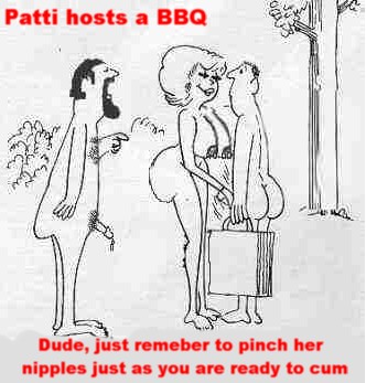 I looked over her back to see that it didn’t all end there, Jon was slurping away at the pussy he just dumped a load of jizz into. He rolled her over to get better access, she wrapped her legs around Jon’s shoulders and began to hump her pussy into his face. She was also massaging her breasts very roughly and biting her nipples, this was going to be a good cum for her. And sure enough it was, she screamed long and low for several seconds and when she finished Jon pulled his face away and it looked like he had got run over but a truck carrying donut glaze. And things went on for a while after that; Patti got on top of me while I lay on the floor and Jon got a good amount of mouth play. After I filled her pussy with my second load of cum; Jon fucked her again, this time missionary and I of course let her set about cleaning the love slime from my completely spent cock.