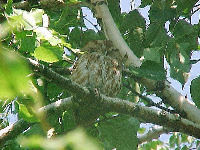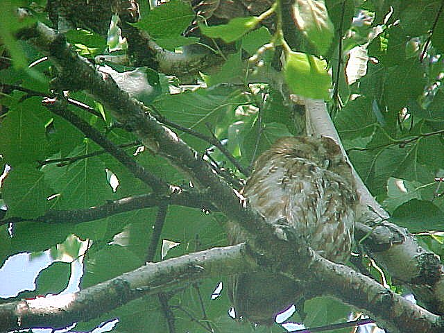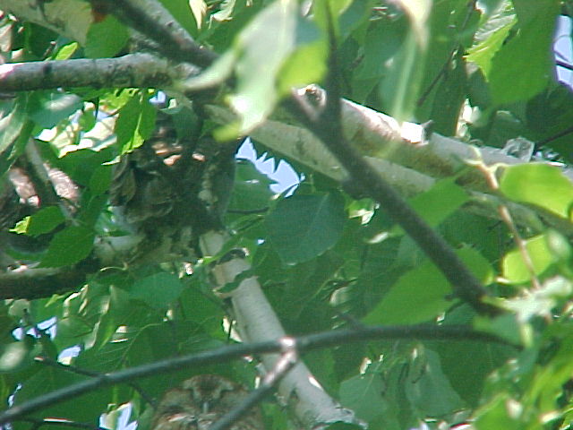 Ended up it was four young owls resting. Tried to get pictures and attached three. The first is one that had it's back turned while the other two are of the one most visible to us.