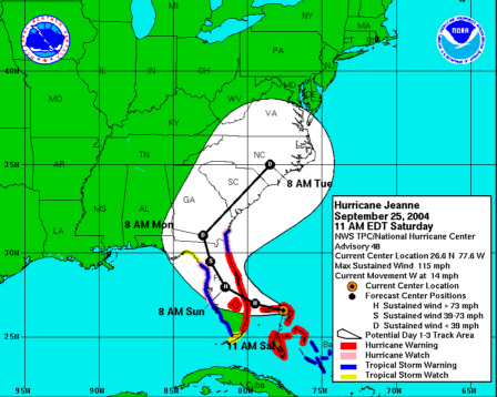 Just heard that Jeanne is now a Cat. 3 hurricane