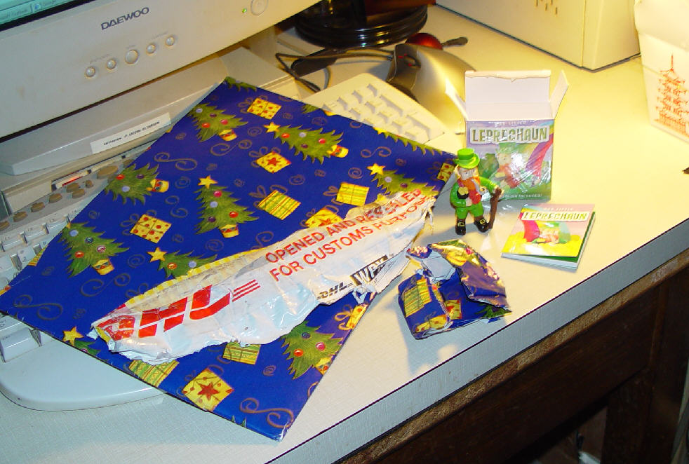 I got home tonight to find a package covered with customs tape (OPENED AND RESEALED FOR CUSTOMS PURPOSES), and inside is a pretty Christmas 'pressie', and another gift along with some crumpled wrap. The nosey buggers were kind enough to carefully slit open the cellophane on the wee folks box, with a razor blade.