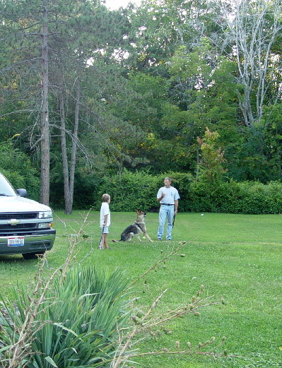 Onco sleeps in his crate/cage in the dinning room for now and is being introduced to one or two new people at a time. The next week and a half will be spent 'bonding' with partner and learning to be part of a people pack. Then he and No1 return to Von der haus Gill for 6 weeks where they'll be cross trained together in three disciplines. They'll come home on the wekends and YES, ......... I will be there to see what they have learned.  (especially the son  )