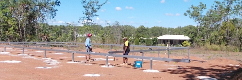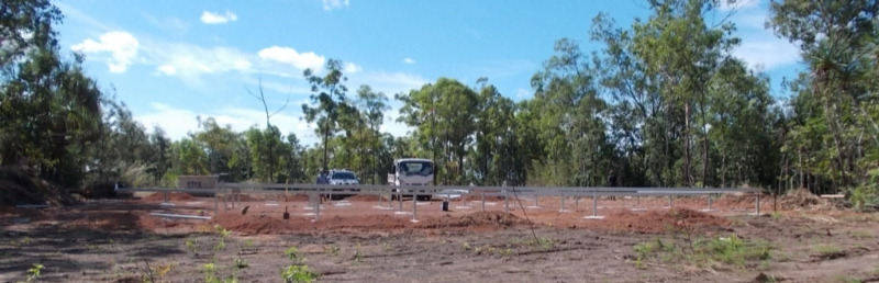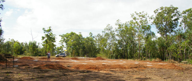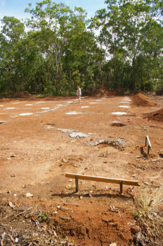 The frame has begun. This is only the living part of the house, not the carport or verandah which are still just concrete pads as yet.