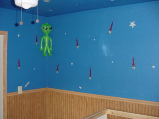 Space is the theme, all the paint and stars glow and the alien is just there to scare him and keep him inline.
