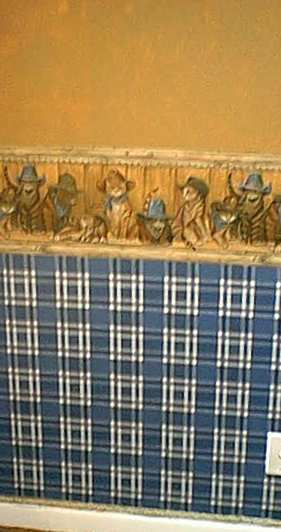 when I took the pic but I managed to magle the paint job til it looks a little like leather....We made a cool hanging lamp from a bucket...like tin punch. We glued rope to the baseboards as trim. All the bedding stuff is denim.